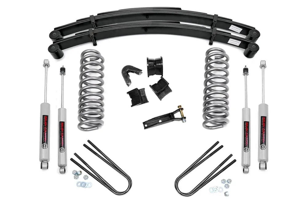 Bold Stance, Better Clearance: Transform your Ford with Rough Country’s 2.5″ Suspension Lift Kit, delivering a more aggressive, leveled look from front to rear. This system eliminates the factory rake for a balanced stance while improving ground clearance to take on uneven terrain and off-road challenges with confidence.Performance-Driven Components: The kit includes a set of durable front coil springs for enhanced ride height without sacrificing comfort or performance. Application-specific 4-degree C-bushings and a track bar drop bracket maintain proper geometry and alignment, ensuring a factory-like ride quality even after lifting.Rear Lifted Leaf Springs for Strength and Support: Engineered for dependability, the included rear leaf springs are double-tapered and feature Teflon pad inserts to improve ride comfort while offering consistent lift and added load support.Premium N3 Shock Absorbers: This kit features Rough Country’s nitrogen-charged N3 shocks, precision-tuned with a 10-stage variable valving system, 18mm piston rods, and fast-cooling 54mm shock bodies for enhanced off-road handling and smooth highway ride quality.Ready for 32-Inch Tires: Gain the clearance needed to run up to 33″ tires, giving your truck a more aggressive profile and increased off-road capability, all with proper wheel backspacing.Built to Last: Backed by Rough Country’s Limited Lifetime Replacement Warranty, this 2.5″ Ford Suspension Lift Kit combines rugged durability with confidence-inspiring performance, on and off the road.