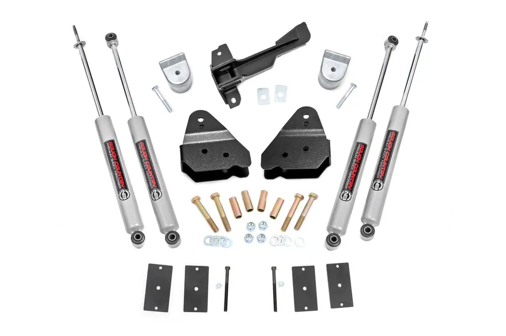 Superior Looks. Give your fourth-generation Ford Super Duty Tremor an impressive upgrade, front to back with Rough CountryΓÇÖs 3″ Suspension Lift Kit! This easy-to-install lift kit raises the front of your vehicle to be equal height with the rear for a leveled, better-than-stock look that gives an improved ride height and a more aggressive appearance.\\Durable Components.This kit features a set of front, lifted coil springs spacers allowing you to gain additional ride height without sacrificing ride quality or performance. A set of radius arm drop brackets as well as a track bar drop bracket is provided to keep everything at optimum angles for a factory-like ride, even after lifting. A set of Rough Country’s premium V2 monotube shocks are also included. The V2 Monotube Shock Absorber is more than an upgrade – itΓÇÖs a true performance shock. Each shock features a T6061 brushed aluminum body with black anodized accents giving it a striking visual appearance that also dissipates heat faster than other materials. The internal 46mm high-flow piston offers countless years of durability.\\Installation. Requiring minor trimming to install, an estimated timeframe of 3-4 hours is recommended to complete this full installation. This full kit can be installed at home and can be completed efficiently and quickly!\\Limited Lifetime Replacement Warranty. Rough Country’s 3-inch Suspension Lift Kit is backed with a limited lifetime replacement warranty towards manufacturer defects. As such, the product is protected from structural and workmanship damage after the date of purchase. With our industry-leading warranty give yourself peace of mind when using Rough Country’s Suspension products!