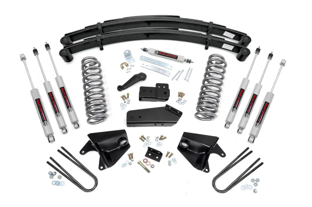 Level Up Your Stance and Style: Give your quad shock factory-equipped 1980-1996 Ford F-150 a bold, aggressive look from front to rear with Rough Country’s 4″ Suspension Lift Kit. This easy-to-install system levels the front with the rear, eliminating the factory rake for a clean, balanced profile and commanding presence on and off the road.Improved Ground Clearance and Ride Quality: Featuring durable front coil springs, this kit delivers increased ground clearance while maintaining excellent ride comfort and performance. Precision-engineered radius arm and axle drop brackets ensure all components stay in optimal alignment, preserving that factory-like ride feel after the lift.Premium Components for Maximum Durability: The fabricated rear lift blocks included in this kit are built tougher than standard cast iron blocks, offering greater strength and long-term reliability, perfect for heavy-duty applications and rugged use.Performance-Tuned N3 Shock Absorbers: Enjoy a superior blend of off-road performance and on-road comfort with Rough Country’s nitrogen-charged N3 shocks. These high-pressure shocks feature a 10-stage variable valving system, a durable 18mm spring-loaded piston rod, and a fast-cooling 54mm shock body for consistent performance in any condition.Upgrade Options for Added Strength: This lift is available with optional replacement rear leaf springs, giving you the flexibility to enhance your load capacity and rear suspension performance as needed.Room for 33-Inch Tires: Rough Country’s 4″ Lift Kit gives you the clearance to run up to 33″ tall tires, transforming your Ford’s capability and stance with the aggressive look you want.Backed by a Limited Lifetime Warranty: Enjoy peace of mind knowing your investment is protected by Rough Country’s Limited Lifetime Replacement Warranty.