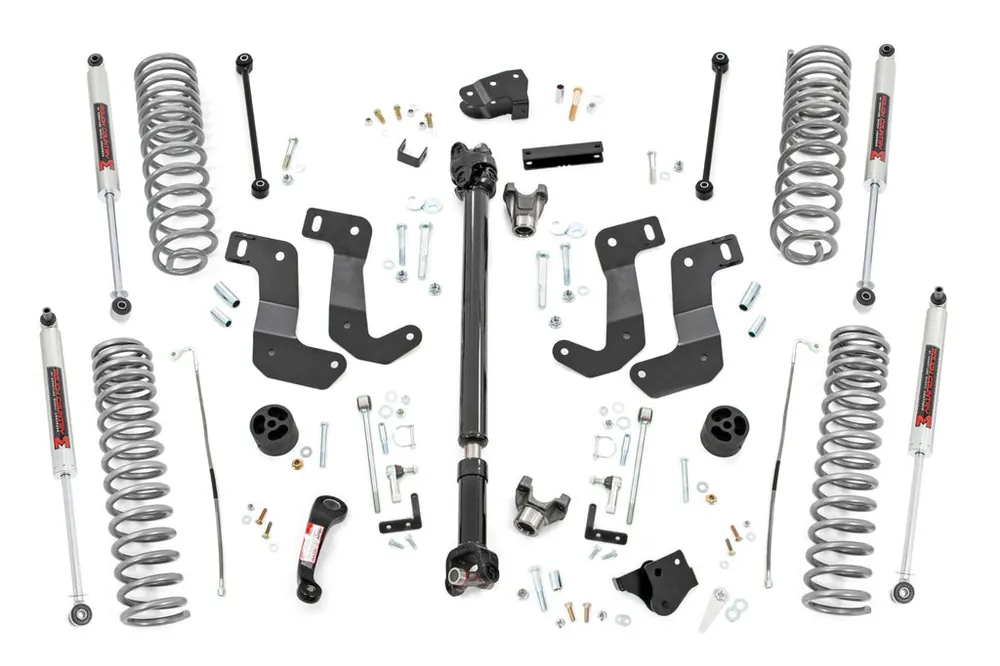 Take Your Gladiator to New Heights: Transform your Jeep Gladiator into an off-road powerhouse with Rough Country’s 6-Inch Suspension Lift Kit. This performance-driven upgrade delivers the clearance needed to fit up to 37-inch tires, giving your ride a bold stance and aggressive look, all while maintaining a smooth, factory-like ride quality.Engineered for Ride Quality and Capability: This all-in-one kit includes front and rear progressive-rate coil springs designed to boost ground clearance and absorb rugged terrain with ease. The included control arm drop brackets optimize suspension geometry, keeping your factory arms at proper operating angles for enhanced stability and handling.Maximum Flex On Demand: Tackle tough trails with confidence using the quick-disconnect front sway bar links, allowing for maximum articulation when you need it most and quick reconnection for highway comfort.Strength Where It Counts: A high-strength front CV driveshaft is included to handle the added lift while maintaining proper alignment. This driveshaft delivers improved durability and twice the strength of stock, making it ideal for hardcore wheeling.Custom Shock Options for Your Style: This kit comes standard with nitrogen-charged N3 shocks, featuring 10-stage variable valving, a robust 54mm body, and an 18mm spring-loaded piston rod. You can also upgrade to M1 monotube shocks for greater performance and heat dissipation on demanding terrain, or go all-in with M1R remote reservoir shocks for maximum cooling capacity and consistent damping in the most extreme off-road conditions.Backed with Confidence: Like all Rough Country products, this kit is protected by a Limited Lifetime Warranty, giving you peace of mind for the long haul.