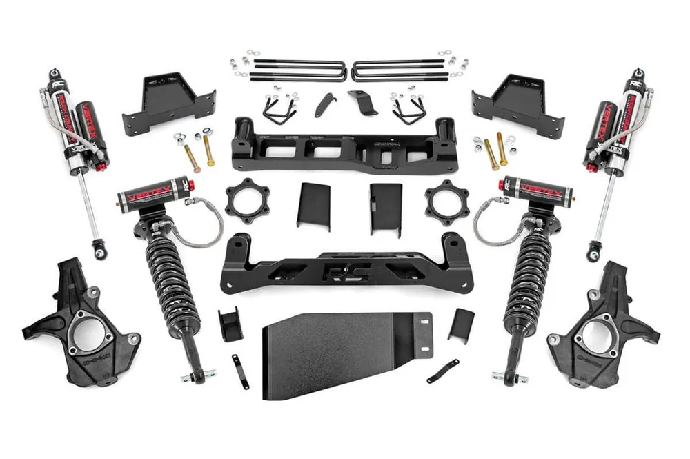 - Front Components Lifted knuckles Vertex Reservoir Coil-overs Front crossmember Rear crossmember Brake line brackets CV spacers Differential drop brackets Differential skid plate Sway-bar drop brackets Hardware