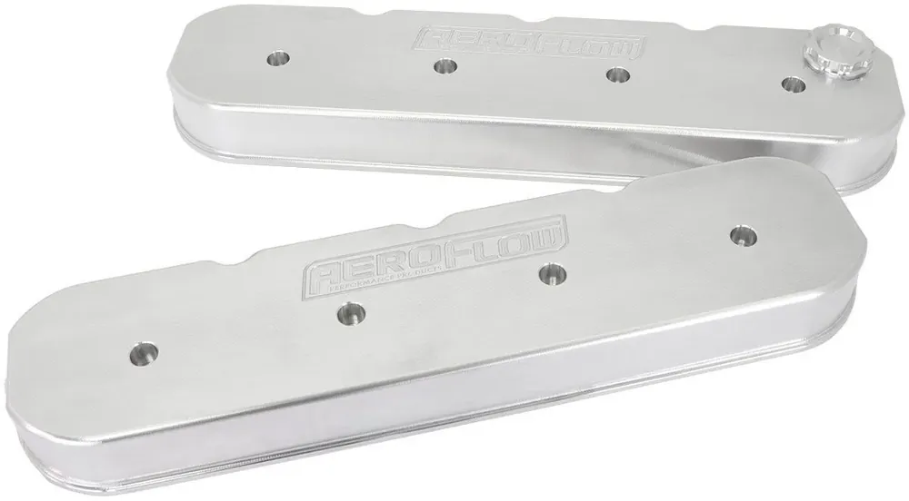 Each rocker cover features two female -10 ORB ports on either end of the valve covers for aftermarket breather/catch can setups. The drivers side valve cover features a low-profile oil fill cap. They are available with or without Aeroflow Logo and available in Raw finish or Black anodized finish.