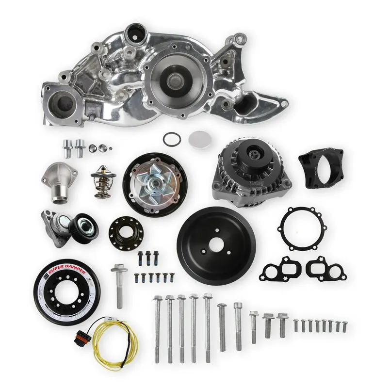 Holley’s Premium Mid-Mount complete accessory system has all accessories pulled in tighter than other accessory drives. At the heart of the system is a “bracketless” design, where the accessories bolt directly to the water pump for a clean, integrated form. The design offers superb engine visibility to show off your horsepower, not your accessories. Among the many swap friendly features are bottom heater outlets for clearance in tight applications. The Holley designed alternator is just as innovative. This premium alternator utilizes 6-phase technology as found on the C7 Corvette. The water pump also shares its design efficiencies with that of the C7 Corvette.