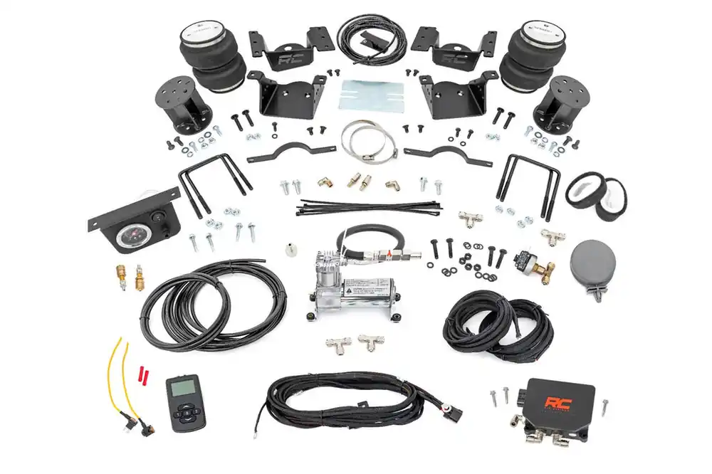 Ideal Leveling. Is your truck your workhorse? The main attraction to the pick-up line is the accessibility to haul and tow as desired. However, due to the amount of weight in the bed, or the condition of the vehicle’s rear leaf springs, this can cause the vehicle to be un-level when under load. Here at Rough Country, we created an innovative new product to ensure that these are troubles of the past. Introducing, Rough Country’s Rear Air Spring Kit.Heavy-duty Construction. Rough Country’s Rear Air Spring Kit features two RC branded high-quality double convoluted airbags complemented with DOT-approved airlines. Whether you plan on towing or hauling in the not-so-distant future Rough Country’s Air Spring kit is the must-have accessory to ensure that your trailer is level reducing the weight off of the tongue of your trailer.┬á Each kit offers 1/4″ push connector fittings and all of the bracketry needed to ensure installation is lightning fast and secure! Rough Country’s Air Spring kit provides up to 5,000 lbs of load support to ensure that you experience less sway and bottoming out when braking and steering!┬á\\Installation. With an estimated timeframe of 1-2 hours this full kit can be installed at home using standard tools and can be completed efficiently and quickly!\\Limited Lifetime Replacement Warranty. Rough Country’s Rear Air Spring Kit is backed with a limited lifetime replacement warranty towards manufacturer defects. As such, the product is protected from structural and workmanship damage after the date of purchase. With our industry-leading warranty give yourself peace of mind when using Rough Country’s Suspension products!┬á