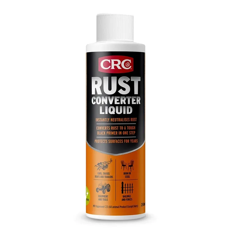 CRC Rust Converter is a unique fast drying coating formulated for treatment of lightly rusted or correctly prepared metal surfaces. CRC Rust Converter neutralises rust and converts it to a tough black primer in one easy step. It binds to the surface and provides a waterproof barrier by sealing out moisture and other outside elements for effective long-lasting rust protection. No more sandblasting, heavy scraping, or grinding.