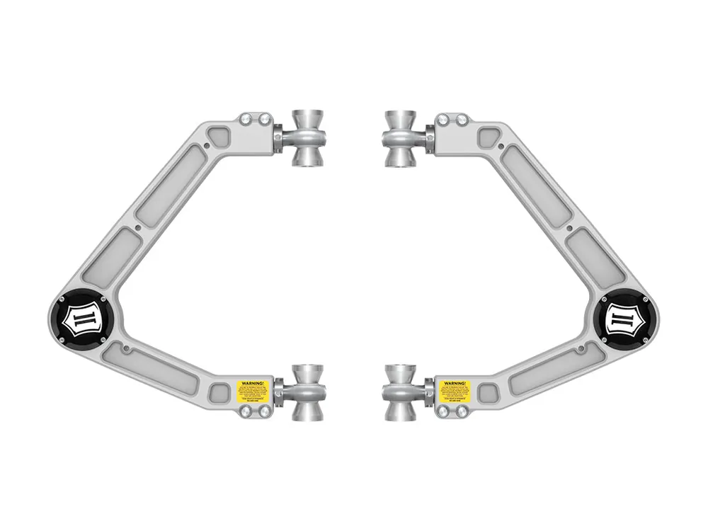 This ICON billet aluminum upper control arm kit is designed to improve the overall performance of the 2023-2024 GMC Canyon/Chevrolet Colorado Trail Boss or ZR2 with corrected front-end geometry, increased camber and caster adjustment, and improved suspension component clearance. Constructed of CNC machined 6061 billet aluminum utilizing a hybrid H-beam cross-section that is light-weight and resists bending forces better than tubular arms. Replacing the OE ball joint with the all-new, serviceable, and rebuildable ICON Delta Joint PRO allows for full bump and droop travel of the front suspension while eliminating bind. FK Rod End 3/4” heim joints provide precise and smooth function throughout the range of travel while ICON’s signature double adjuster sleeve allows for on-vehicle camber and caster adjustment. Included with all components and hardware necessary for a complete install, these billet UCAs are the perfect front end upgrade for the 2023-2024 GMC Canyon/Chevrolet Colorado Trail Boss or ZR2.