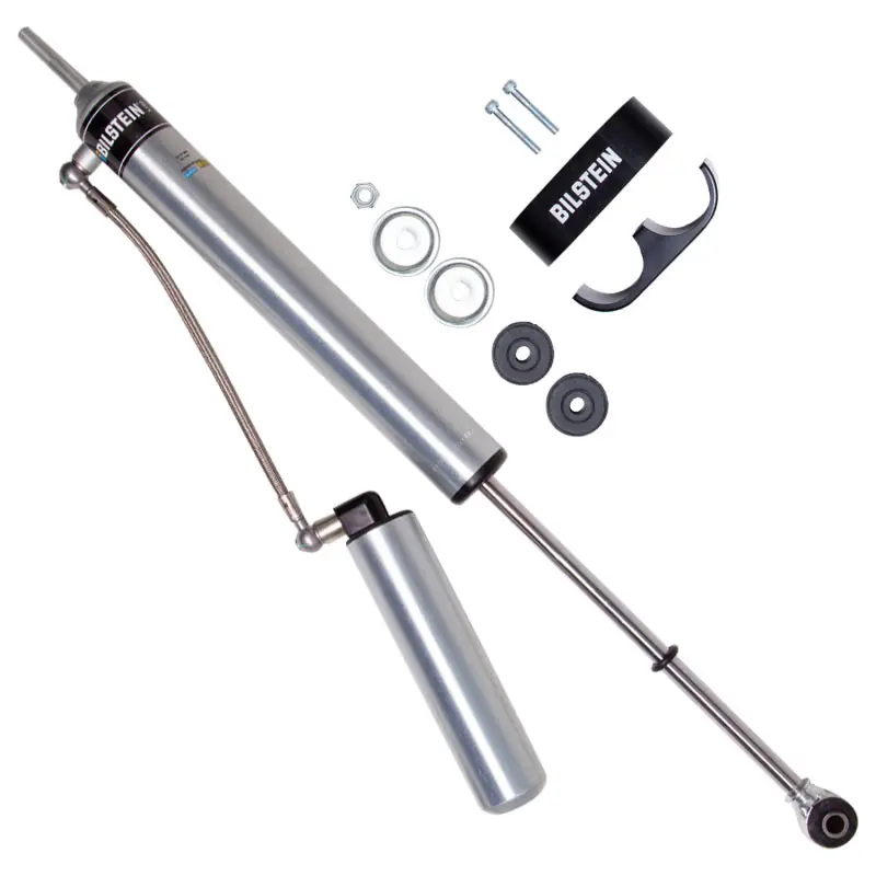 Bilstein B8 5160 remote reservoir shock absorbers are designed as a direct fit solution for lifted trucks and SUVs. The remote reservoir will offer increased cooling capacity and wheel travel to optimize overall performance compared to a traditional shock absorber. These shock absorbers feature a monotube design for consistent fade free performance and utilize velocity sensitive digressive valve settings which are tuned for each specific application. Each shock absorber is fitted with a unique 360 degree swivel banjo hose fitting and an attractive billet reservoir mount where applicable providing a clean, low profile installation. B8 5160 remote reservoir shock absorbers will increase overall durability of your vehicle allowing you to conquer the harshest of off-road environments.