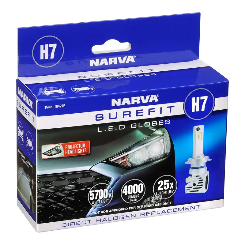 The new Surefit Globes offer superior range and colour to any standard halogen globe. Narva Surefit Globes are also cooled by an IP65 rated fan, that combined with low current draw Lumiled ZES L.E.Ds results in a headlight globe that lasts up to 25 times longer than its halogen counterparts.