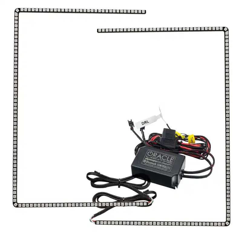 Introducing the new ORACLE Lighting 2017-2019 F-250/F-350 Superduty Dynamic ColorSHIFT(tm) DRL Kit. The new ORACLE Lighting Dynamic ColorSHIFT(tm) DRL is the latest advancement in our expansive lighting modifications. The Dynamic features allow the user to run multiple moving color patterns through the DRL, creating a vivid eye-catching lighting effect. Does not require you to remove your factory DRL so your factory headlights and DRL works just like normal without error codes like other kits out there. Perfect for shows, meets, and tailgates! Conveniently controlled through a free smartphone App, the system features over 200 pre-programmed moving patterns as well as static color control and white mode for normal street driving. In addition to the pre-programmed features the user can also create custom designs through pixel editing in the app. New user-friendly design is a simple plug and play design making wiring easy for even a novice. Connect the ring terminals to the + and – battery terminals then control your lights from the smartphone app. Warranty lifetime period covers the LED and driver components. Hard part decay due to UV damage, oxidation, or environmental conditions are not covered under this stated period. Important note: This kit will only fit models with Factory LED Headlights.
