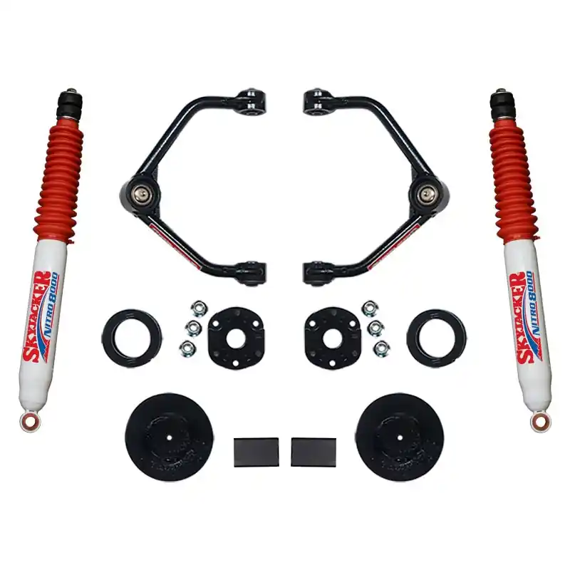Skyjacker’s new 3 In. Upper Control Arm lift kits for the 2019 and up Ram 1500s offer easy installation and an assertive look that provides you with confidence in your Ram 1500.Give your truck the stance and look it wants with Skyjacker’s 3 In. Upper Control Arm lift kits. This lift kit comes with a set of Upper Control Arms that are made out of high-strength DOM tubing to withstand extreme amounts of stress and loads, and a gusset plate stiffener is welded in between the Control Arms for added rigidity and strength. You will also optimize and improve the steering geometry and strength of your vehicle with a pair of Skyjacker Upper Control Arms. With the revised steering geometry you get increased suspension travel, and our Upper control arms are manufactured in-house in the USA. Our UCA’s include an optimum pivot ball joint for improved flexibility and to reduce stress. The ball joints are greasable to increase service life. You are not only increasing on-road handling but also off-road strength and capability when you choose a set of Skyjacker Upper Control Arms. This lift kit also comes with front strut spacers so you can keep your factory ride and rear coil spring spacers, bump stop spacers, and Nitro 8000 shocks to provide lift and a comfortable ride in the rear of the truck. With this set up you gain enough clearance to run 33 In. tires to gain a clean and assertive look from the front to the rear of this truck. This Skyjacker 3 In. Upper Control Arm lift kit comes with everything you need to give your truck the upper hand. This lift kit is 100% bolt-on, which does not require any cutting, welding, or drilling. This also means you can return to stock at any time if you would like to. Common tools and a home garage is all you need for this lift kit. Comes with Skyjacker’s limited lifetime warranty.