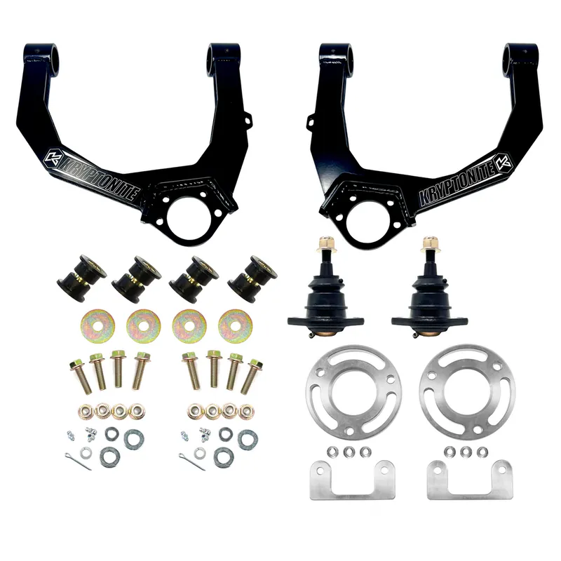 This Leveling kit includes everything you need to lift the front of your truck while retaining OEM struts. Kit includes billet aluminum spacers, we’ve ensured full suspension travel with our boxed Kryptonite Upper Control arms. These arms are laser cut and welded into an extremely strong design. Made with pride here in small town USA and backed with a Lifetime Warranty.