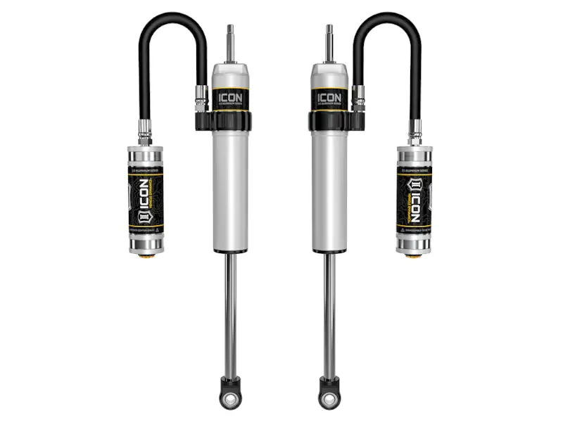 ICON Vehicle Specific (V.S.) 2.5 Aluminum Series shocks are designed and built to give your vehicle outstanding performance off-road and a smooth ride on the street. These shocks are configured specifically for each application in both length and damping tune. Like all ICON’S Shock Absorbers, V.S. 2.5 Aluminum Series shocks are 100% rebuildable and 100% revalveable. For piggyback and specific remote reservoir applications, ICON’S unique use of a 6061 billet aluminum manifold a few inches below the top cap of the shock creates an internal Bump Zone that when used creates an additional 20% of damping force. This additional force helps prevent harsh bottom outs and controls the suspension when compressing at high velocity. If you are looking for a more user defined tune, consider looking into the Compression Damping Control Valve (CDCV) or the Omega Series bypass shocks.