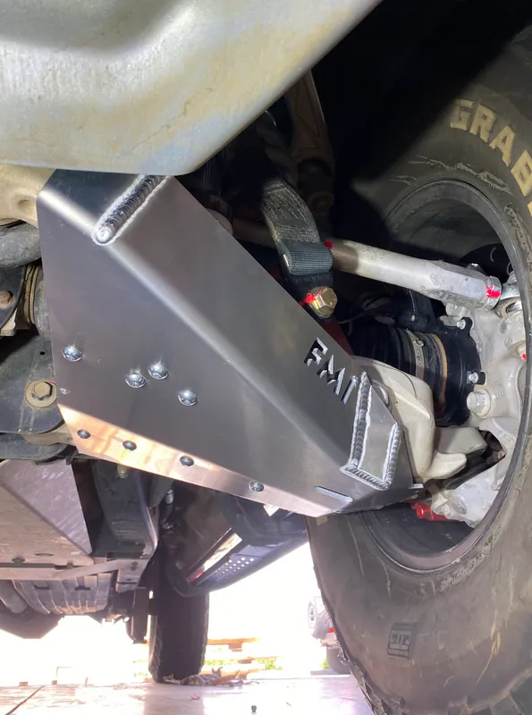 - Each skid plate is precision laser cut out of 3/16 thick aluminum, CNC bent and TIG welded in-house so it can mount perfectly under the stock lower arms with steel brackets that are powder coated in a hammer black texture.