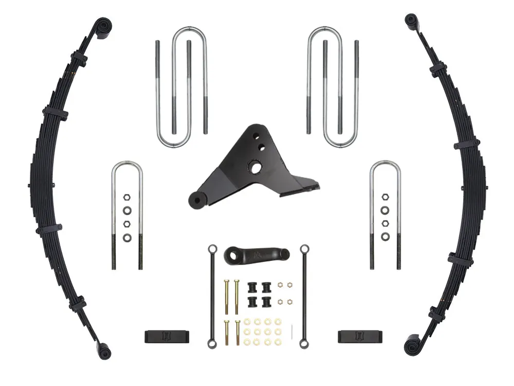 This 4″ system is designed to lift your Ford Super Duty. 4″ front leaf springs provide room for 35” tires. This system uses a custom progressive pack for ultimate ride quality, while providing 4″ of lift. This system comes with a 1.75″ bump stop spacer (not pictured) to prevent spring fatigue during the suspension cycle. Also included in this kit is 4” rear block kit, with 15” U-bolts for a leveled stance. This system is the ideal for all Super Duties.