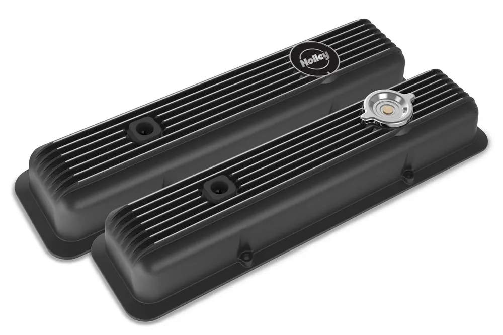 Holley is pleased to introduce their Muscle Series Small Block Chevy valve covers inspired by 1970’s era GM factory L82/LT1/Z28 equipped engines. These valve covers are a continuation of Holley’s Vintage Series valve cover line featuring a classic finned design and retro styling cues.Each set consists of one valve cover with a twist-in oil fill knockout (oil fill cap included) and one with a recessed area to place an adhesive backed Holley emblem (also included) or any round emblem of your choice.