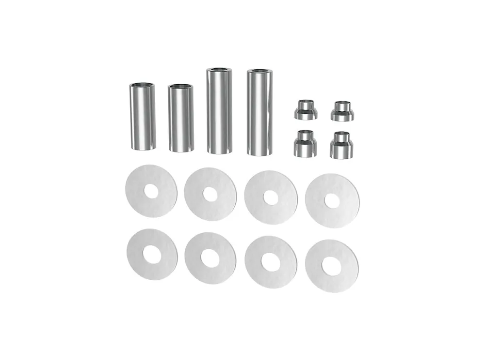 The ICON Vehicle Dynamics Lower Control Arm Hardware Kit for the 2016-2023 Toyota Tacoma includes all required components to size the pivot bushings on a pair of ICON front lower control arms to fit the frame mounts and OE mounting bolts/alignment cams. Misalignment spacers for the lower eyelet of aftermarket coilovers are also included to size the bearings to fit the control arm mounts. All components are CNC machined and laser cut to ensure an exact fit and a smooth install.