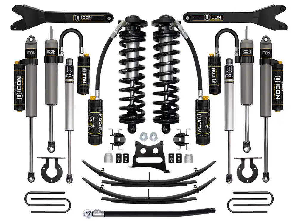 The ICON 2.5-3” coilover conversion suspension system is a great way to lift your 4WD 2011-2016 Ford F-250/F-350 Super Duty while improving ride quality and performance. This upgraded Stage 6 system is great for towing, rough construction site terrains, and country dirt roads all while keeping a smooth highway feel. Also included in this stage are ICON’s CDC Valve front, front secondary, and rear shocks, for those desiring an easy way to tune the ride externally with 10 settings, from soft to hard. ICON’s Stage 6 System is comprised of 2.5 Series CDCV remote reservoir coilovers that are adjustable from 2.5-3” of front lift over stock, CDCV 2.5 Aluminum Series remote reservoir front secondary shocks for maximum front damping ability, adjustable front track bar with massive FK rod end, fabricated ICON radius arms, dual steering stabilizer kit with ICON 2.0 Aluminum Series stabilizers, alignment cams for adding caster, rear leaf spring expansion packs with blocks and U-bolts for a more compliant ride and reduced axle wrap, and ICON 2.5 Aluminum Series CDCV piggyback reservoir rear shocks. ICON 2.5 Series remote and piggyback reservoirs ensure optimum performance by increasing the duration of consistent damping regardless of situation, keeping the shocks at a cooler operating temperature during heavy use. With the endless hours ICON has spent testing and tuning our suspension components and shocks as a complete package, you can rest assured you have the best suspension solution on the market.