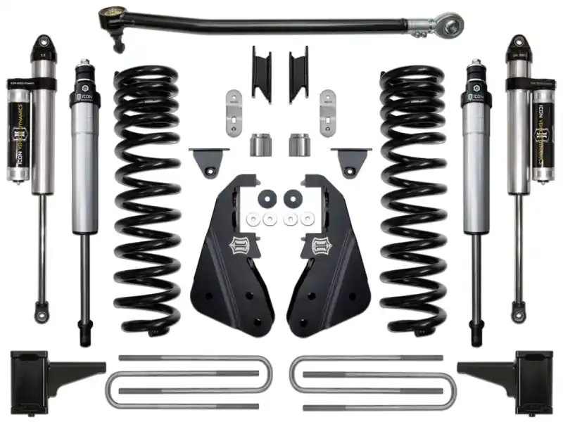 This ICON Vehicle Dynamics 4.5†suspension system is a great way to lift your 4WD 2017-UP Ford F250/350 Super Duty while drastically improving ride quality and performance. The Stage 2 system is perfect for on-road and off-road use including towing, job site duty and general off-road adventure. ICON’s Stage 2 System is comprised of dual rate coil springs, radius arm drop brackets, adjustable track bar, 5″ block kit, and ICON 2.5 Aluminum Series internal reservoir front and piggyback reservoir rear shocks. With the endless hours ICON has spent testing and tuning our suspension components and shocks as a complete package, you can rest assured you have the best suspension solution on the market.