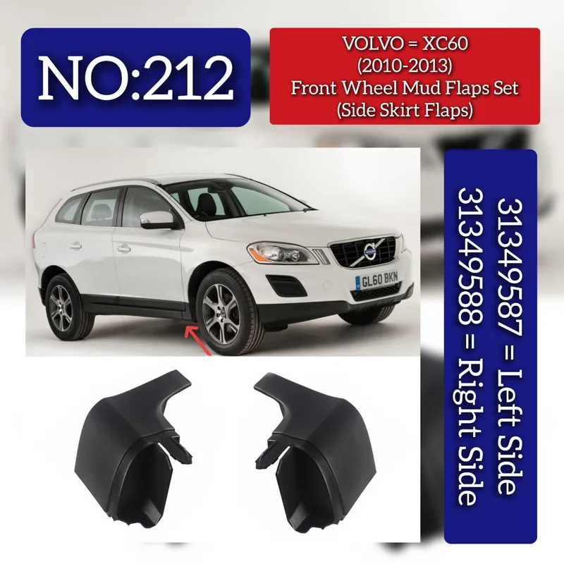 This Front Wheel Mud Flaps Set, comprising left (31349587) and right (31349588) side skirt flaps, is specifically designed for the VOLVO XC60 II (246). Crafted to provide optimal protection, these mud flaps shield your vehicle’s front wheel arches from mud, stones, and road debris, helping to maintain the bodywork’s condition and reduce corrosion risk. Precision-engineered for a seamless fit, they ensure durability and long-lasting performance while preserving the vehicle’s aesthetic integrity. An essential accessory for maintaining your XC60’s exterior in demanding driving conditions.