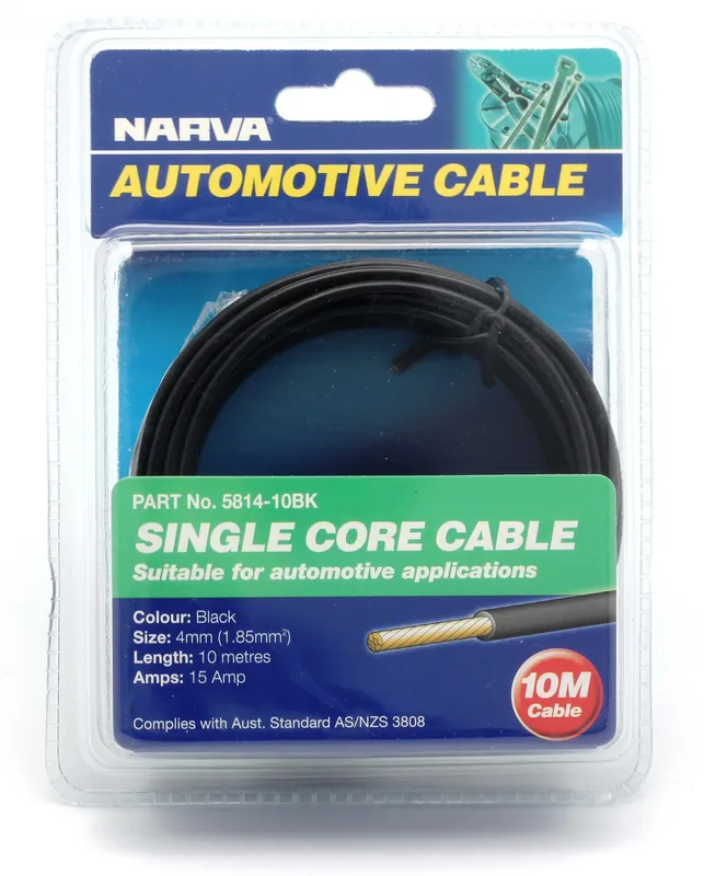 15A 4MM BLACK SINGLE CORE CABLE (10M). The Narva cable uses oxygen free copper and RoHS compliant polyvinyl-chloride.