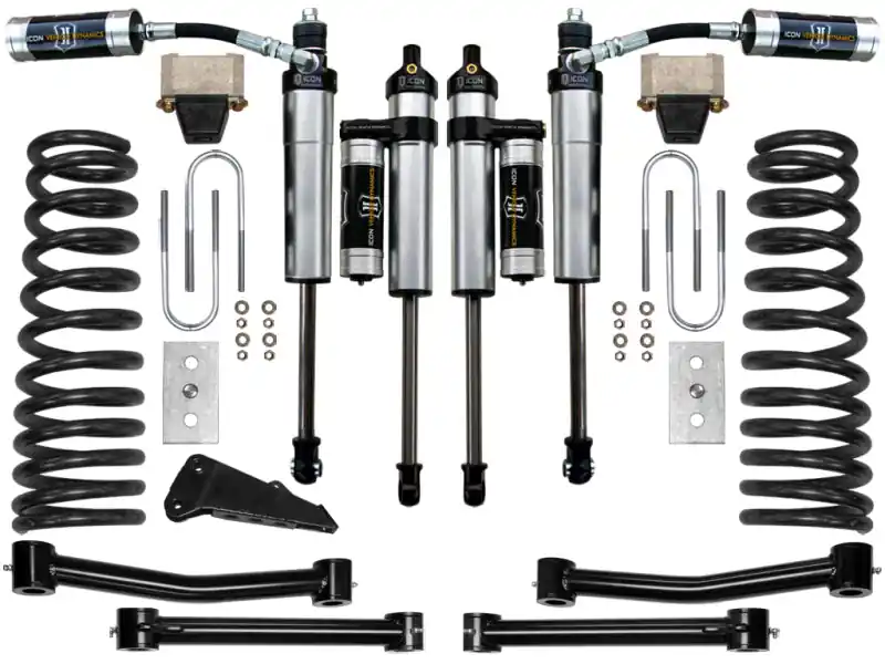 2009-2012 Ram 2500/3500 4.5″ Stage 3 Suspension System utilizes the same technology as the 2.5″ systems while adding lift height and ground clearance. Additional engineered front end components are added to ensure proper steering geometry with improved function throughout the entire travel range whether on or off road. The Stage 3 System is comprised of dual rate coil springs, tubular steel upper & lower link arms, polyurethane bumpstops w/ billet extension, sway bar drop brackets, forged pitman arm, track bar drop bracket, 2.5″ V.S. Series shocks, rear 2.5″ lift blocks with u-bolts. ICON 2.5″ Series shocks extend the performance of the kit by increasing the duration of consistent damping regardless of situation. These shocks include FK bearings, billet top cap & rod ends, 7/8″ shafts for strength, and the industry only forged stem on a 2.5″ shock with rolled threads. ICON steel upper & lower links increase performance, strength, and range of alignment. These link arms decrease the bind found in the factory link bushings. This mid-level performance system with billet link arms is great for towing, rough construction site terrains, and country dirt roads all while keeping a smooth highway feel. Installing this kit allows proper clearance for 35″ tall tires with no modifications, and some 37″ tires with minor fender well trimming for clearance. With the endless hours ICON has spent testing and tuning our suspension components and shocks together, you can rest assured you have the best suspension solution on the market.