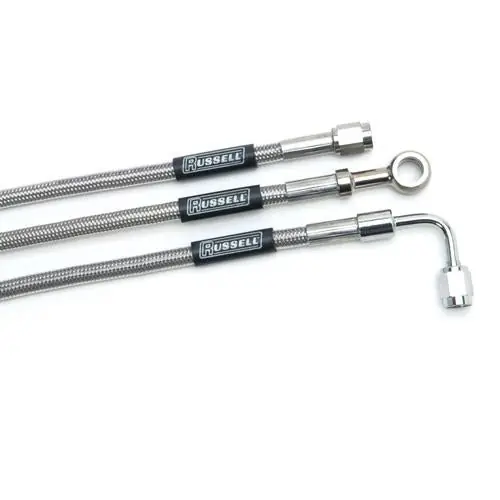 Competition brake hose offer better braking performance and a firmer pedal feel. Russell brake hose are pre-assembled, and ready for adapter fittings. They are constructed from high quality Stainless steel hose featuring zinc plated hose ends. You can choose from -3 or -4 brake hose from lengths of 9″ up to 53″ for your custom needs. These competition brake hose assemblies are Non-D.O.T. approved and are for off-road use only.