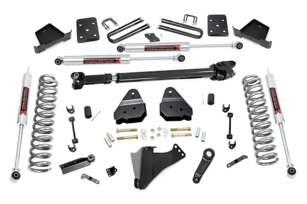 Give your 17-20 Ford Super Duty an impressive upgrade, front to back with Rough CountryΓÇÖs 4.5″ Ford Suspension Lift Kit! This easy-to-install lift kit raises the front of your vehicle to be equal height with the rear for a leveled, better-than-stock look that gives an improved ride height and more aggressive appearance.\\This kit features a set of front, lifted coil springs allowing you gain additional ride height without sacrificing ride quality or performance. A set of sway bar drop brackets and track bar are provided to keep everything at optimum angles for a factory-like ride, even after lifting.\\A set of Rough Country’s premium N3 shocks are also included. These fine tuned 10-stage variable high-pressure Nitrogen charged shocks offer a fantastic blend of off-road action and smooth highway ride quality. With a durable 18mm spring-loaded piston rod and faster-cooling 54mm shock body.\\Get the wheels you want! Rough Country’s 4.5″ 17-20 Ford Suspension Lift Kit comes with everything you need to fit up to a 35″ tire with proper wheel backspacing.\\Best of all, Rough Country’s 4.5ΓÇ¥ Ford Suspension Lift Kit is backed by our Lifetime Replacement Warranty!
