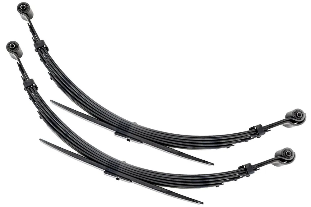 Added Lift Height and Ride Comfort. Take your suspension kit to the next level with Rough Country’s Replacement Leaf Springs. Constructed from high-quality materials and designed specifically for the weight of your vehicle. This enhanced replacement spring will provide a factory-like feel while retaining your suspension lift height.┬á\\Durable and Off-Road Ready. Rough Country’s Replacement Leaf Springs are designed to tackle any terrain that they are faced with. Featuring a multi-leaf design and spring pads this reduces the friction and maximizes comfort. Each leaf pack utilizes tapered leaves for improved flexibility at their ends.┬á\\Installation. Rough Country’s Replacement Leaf Springs┬áoffer a 100% bolt-on installation estimated to take approximately 1-2 hours depending on vehicle condition. Simply remove the pre-existing leaf spring and use the stock hardware to equip your vehicle with this high-quality replacement.┬á\\Lifetime Replacement Warranty. Rough Country’s Replacement Leaf is backed with a 5-year replacement warranty towards manufacturer defects. As such, the product is protected from structural and workmanship damage after the date of purchase. With our industry-leading warranty give yourself peace of mind when using Rough Country’s Suspension products!┬á