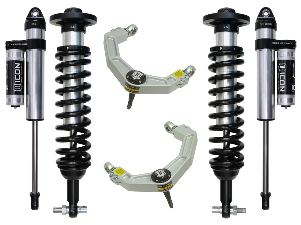 This system features upper control arms with ICON’s patented Delta Joint. The Delta Joint is a heavy duty high angle ball joint that combines the durability of a ball joint with the performance characteristics of a traditional uniball. While the industry standard uniball does a great job of allowing the control arms of a vehicle to articulate with little bind, they do have an inherent weakness that leaves more to be desired when used in a daily driven application – exposure to the elements. The Delta Joint features a zinc plated housing providing the first layer of corrosion resistance, while a tough grease seal keeps potentially harmful elements out of the inner workings of the joint. Metal on metal construction and a greasable design increase the longevity of the Delta Joint while at the same time allowing for noise-free operation. What makes the Delta Joint unique is that it brings the best of both worlds to ICON upper control arms with features that make it more robust than a uniball, and at the same time capable of greater angularity than a typical ball joint.