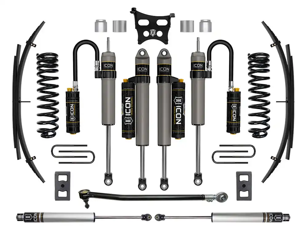 This ICON Vehicle Dynamics 2.5” suspension system is a great way to lift your 4WD 2023 Ford F-250/F-350 Super Duty while drastically improving ride quality and performance. The Stage 5 system is perfect for on-road and off-road use including towing, job site duty and general off-road adventure. ICON’s Stage 5 System is comprised of dual rate coil springs optimized for trucks equipped with gasoline engines, dual steering stabilizer kit with ICON 2.0 Aluminum Series stabilizers, on-vehicle adjustable front track bar, rear leaf spring expansion packs with blocks and U-bolts for a more compliant ride and reduced axle wrap, and ICON 2.5 Aluminum Series CDCV remote reservoir front and CDCV piggyback reservoir rear shocks, for those desiring an easy way to tune the ride externally with 10 settings, from soft to hard. With the endless hours ICON has spent testing and tuning our suspension components and shocks as a complete package, you can rest assured you have the best suspension solution on the market.