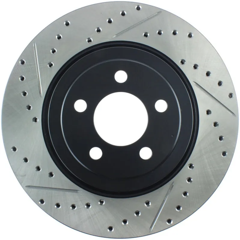 StopTech Drilled and Slotted Sport Rotors are 1-piece direct replacement brake discs for factory brake systems and stock calipers that look great behind your wheels – and offer significantly improved braking performance. The unique cross-drilling and slotting aids with heat and brake dust dispersal; prevents glazing of the pads; adds bite and improves wet and dry braking performance. Built to last; the black e-coating provides protection from corrosion and the high carbon metallurgy (in most applications) offers quieter operation; better crack resistance and increased performance.