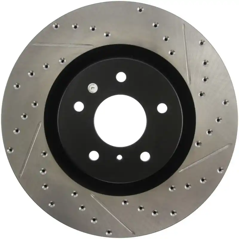 StopTech Drilled and Slotted Sport Rotors are 1-piece direct replacement brake discs for factory brake systems and stock calipers that look great behind your wheels – and offer significantly improved braking performance. The unique cross-drilling and slotting aids with heat and brake dust dispersal; prevents glazing of the pads; adds bite and improves wet and dry braking performance. Built to last; the black e-coating provides protection from corrosion and the high carbon metallurgy (in most applications) offers quieter operation; better crack resistance and increased performance.