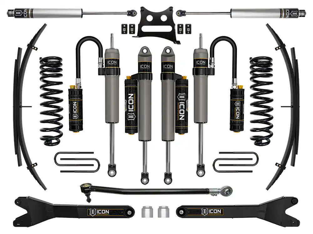 This Stage 6 system sees the inclusion of the ICON Vehicle Dynamics Ford Super Duty Radius Arm System that feature a sealed pivot bushing that minimizes road feedback and ensures a long life and quiet operation. Their on vehicle caster adjustment allows for proper caster while eliminating the need for caster bushings or drop brackets. Additionally, their fabricated, fully boxed design ensures strength and utilizes a profile optimized for tire clearance at full steering lock, making a 37” tall tire clear without coming in contact with the radius arm.