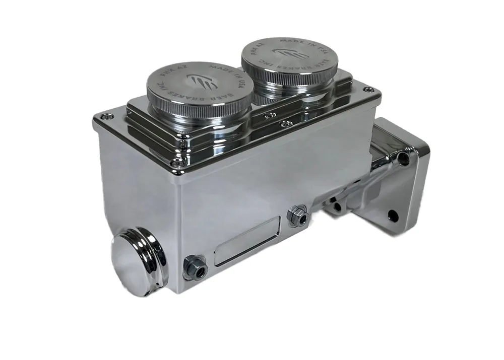 This Remaster master cylinder features a small, compact, 1-piece body machined out of 6061 T6 billet aluminum with a 1″ bore, left side ports and a 4-bolt mounting flange fitting many early Mopar applications. The billet top is attached with 6 allen screws and has two large billet aluminum, knurled screw-on caps making for easy filling without spillage. The unique outlet port design allows for either inverted flare (w/included removable seats) or banjo style, straight fittings. The Remaster is compatible on most long and short, w/included bullet, boosters or manual brake applications. Optional proportioning valves also available