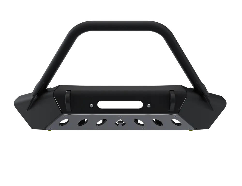 Artec Industries’ Bantam Series Front Bumper with Hoop: USA-crafted from CNC laser-cut steel. Features amplified clearance, reinforced winch mount, aerospace-grade skid, and a robust hoop. Choose bare steel or matte black powder coat.