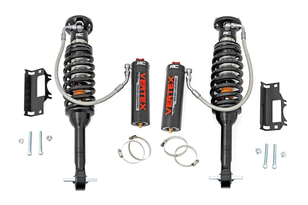 Behold: The pinnacle of off-road performance and smooth ride quality in an affordable package has arrived with Rough CountryΓÇÖs 2.5 Vertex 8-Stage Adjustable Reservoir Shocks. These high-performance reservoir shocks offer an elite ride-quality in every situation you face, with an 8-stage adjustable damping system that lets you perfectly dial-in your ride for whatever lies ahead. Whether you want a smooth ride for city streets or the ultimate damping for off-road mayhem, a quick spin of the dial lets you adjust each shock to the exact performance specifications you desire.Rough CountryΓÇÖs Nitrogen-charged Vertex Shocks feature a monotube design with an external reservoir for increased oil capacity and damping sensitivity. Each shock features a massive 2.5in diameter piston and a high-flow 22mm chrome hardened piston rod that simply dwarfs the competition. When it comes to investing in a high-end shock, youΓÇÖll be pleased to find that Rough CountryΓÇÖs 2.5in piston design is beefier and offers an impressive 56% greater fluid capacity than the average reservoir shock.A 3-stage, fortified seal system ensures your Vertex shocks keep kicking while the beautifully designed honed steel body offers a long lifespan of reliable performance and killer good looks. This shock is designed to be a true eye-catcher, with a beautiful silver finish, laser-etched RC logo, matching “Vertex” decals, and CNC-machined Billet Aluminum accents. Rear shocks feature a durable bracket system with laser-etched logo and a premium braided steel reservoir line.Includes an Industry-leading 3-year Warranty!