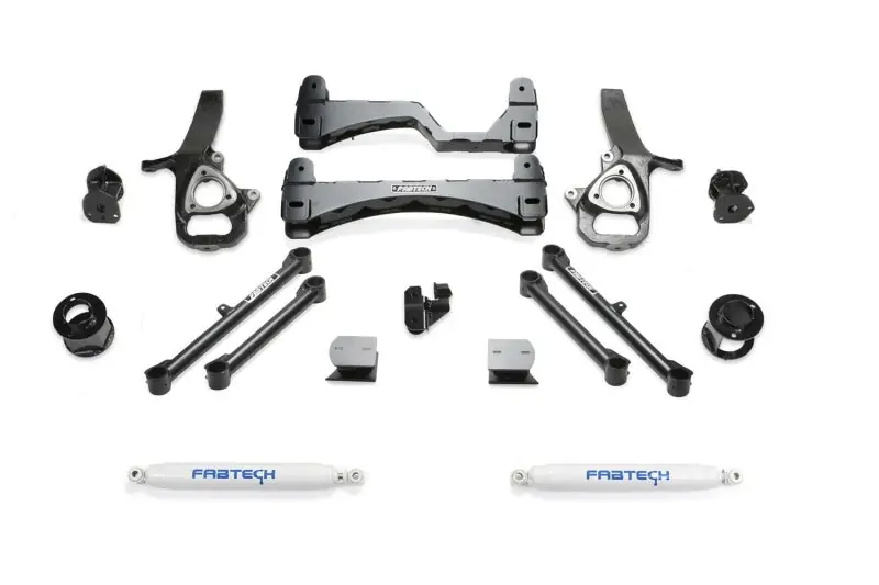 This system is a great choice for 2WD Ram owners looking to keep that stock ride yet want big tires and wheels. The factory suspension is relocated with heavy duty bolt on bracketry that will provide years of trouble free service. The system features Fabtech’s proven IFS technology with extended length ductile iron steering knuckles for proper factory electronic stability control functionality. Heavy duty 1/4in thick steel lower control arm crossmembers provide superior ground clearance for offroad use. Rear lift is accomplished with steel coil spring spacers that utilize the factory coil springs for stock load carrying capacity with a great highway ride. The Basic lift kit includes front coilover spacers that utilize the factory Coilover shocks for a stock like ride. CROSSMEMBERS: 1/4in thick steel lower control arm crossmembers are arched for maximum ground clearance. Four adjustable alignment cams provide a wide range of adjustment. The fully welded box design of these crossmembers provides additional strength to the front suspension. STEERING KNUCKLES: Extended length ductile iron steering knuckles retain near stock track width keeping the tires under the fenders. These steering knuckles are designed to work in conjunction with the factory ESC for proper functionality at all speeds. COILOVER SPACERS: Thick wall tubing and 1/4in thick steel is used to build these 6in lift spacers retaining the factory Coilover shocks for a stock ride. SWAY BAR BRACKETS: Heavy duty drop brackets retain the factory link ends at the correct angle for a positive road feel without creating binding at full droop. REAR COIL SPRING SPACERS: Steel rear spring spacers utilize the factory coil springs retaining the stock load carrying capacity and ride comfort. REAR TRACK BAR BRACKET: The bolt on relocation bracket re-centers the rear axle for the new ride height while retaining the factory roll center of the vehicle. PERFORMANCE SHOCKS: Extended length twin tube shocks provide a good highw