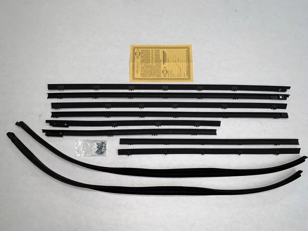 A window sweep kit is a set of replacement seals for classic car doors and windows. These sweeps help keep out water, dust, and wind while allowing the window glass to move smoothly. Replacing worn sweeps restores proper sealing, reduces interior noise, and protects door panels from moisture damage.